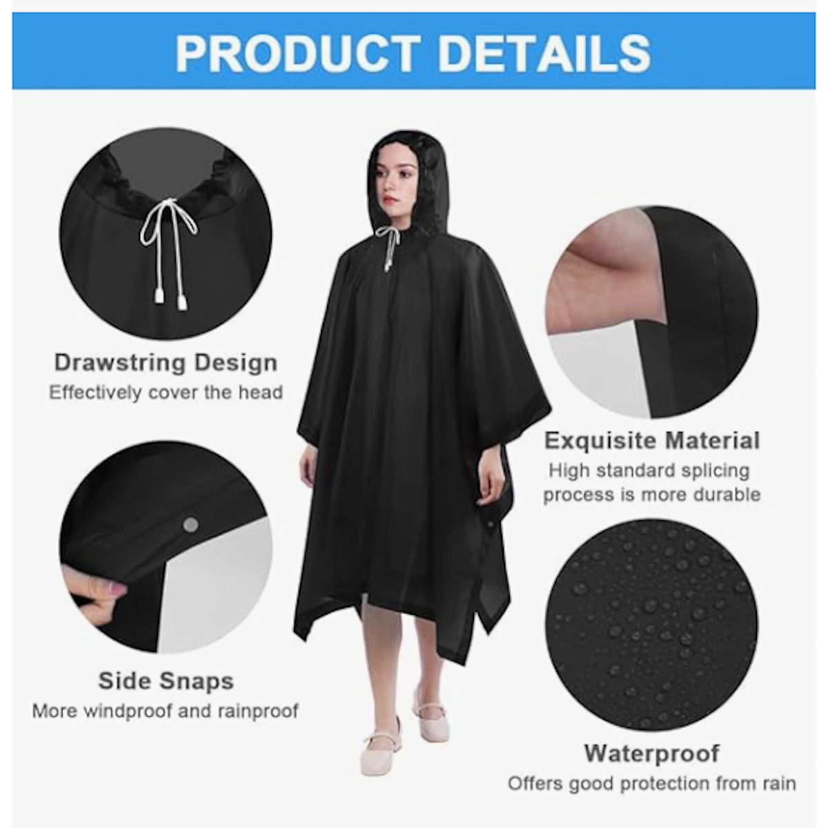 Висококвалитетен за повеќекратна употреба: мантилот е изработен од EVA (етилен винил ацетат), кој е нетоксичен, без мирис, издржлив, отпорен на кинење и безопасен. Пончото е водоотпорно, исклучително отпорно на абење и може повторно да се употребува.