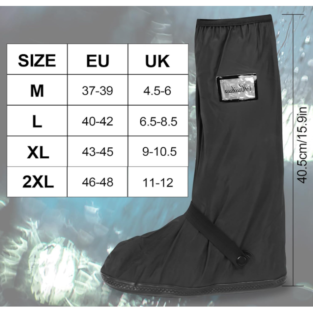 Прилагодлив дизајн со еластична лента: водоотпорните навлаки за чевли се опремени со широк отвор што го олеснува ставањето и вадењето, спречува прекумерно кинење и го зголемува животниот век на капаците на чевлите за дожд. Патентот е двослоен и може подобро да спречи навлегување на дожд во чевлите. Прилагодливата еластична лента на врвот одговара на различни форми на нозе. Големина: L: (40-42) XL (42-45)