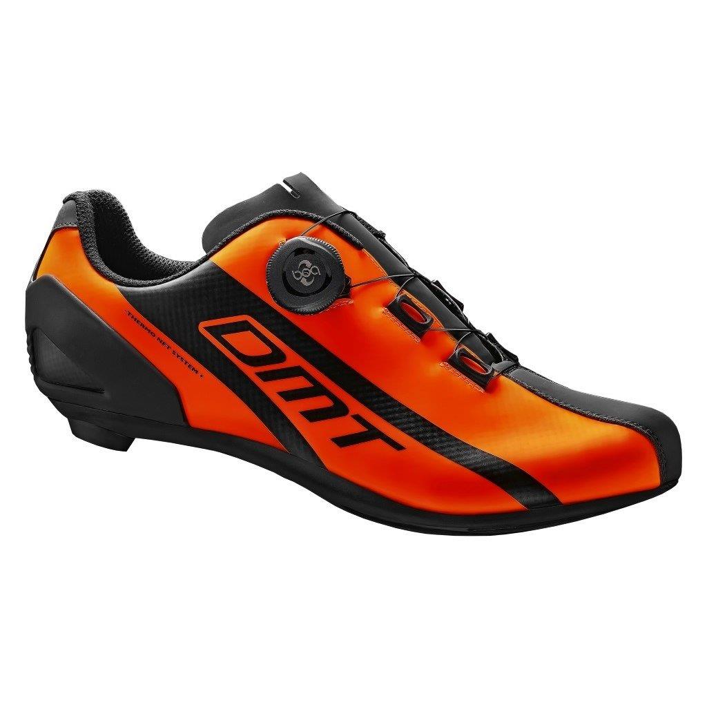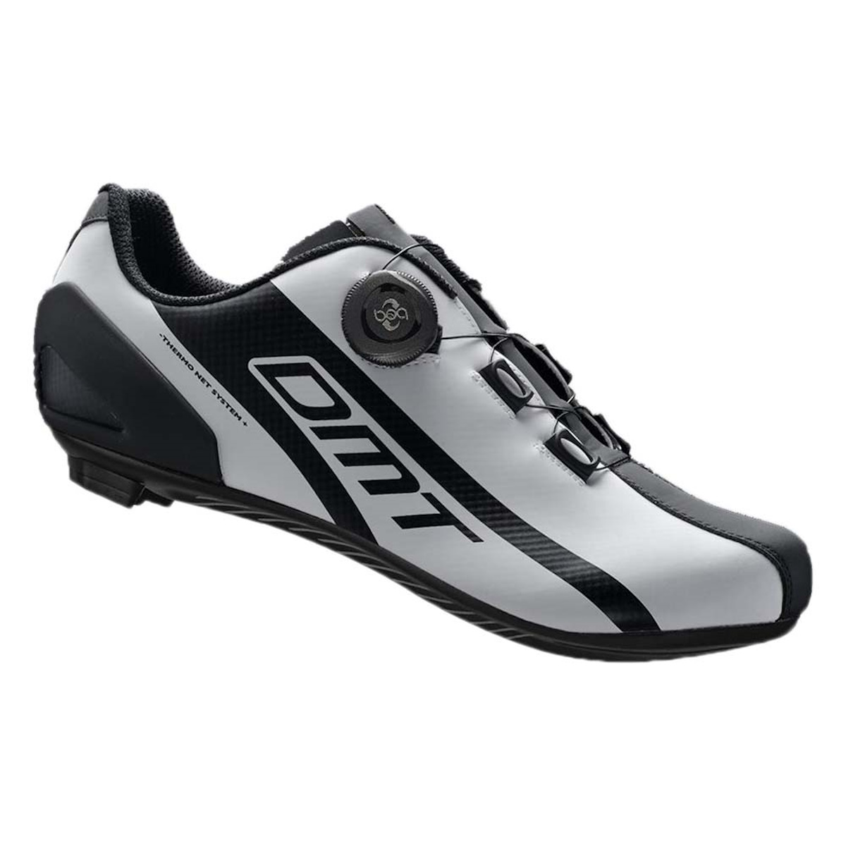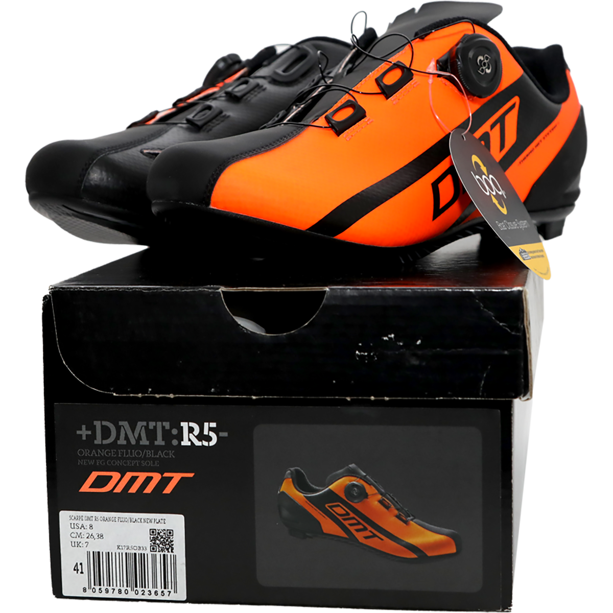Патики за друмски велосипед, италијански бренд DMT, модел R5. Прицврстени со системот за заврзување BOA. Прецизното прицврстување и зацврстување на BOA во петицата обезбедуваат оптимална поддршка на стапалото додека се вози. Страничните мрежести дупки го пренесуваат вишокот топлина во топлите денови.