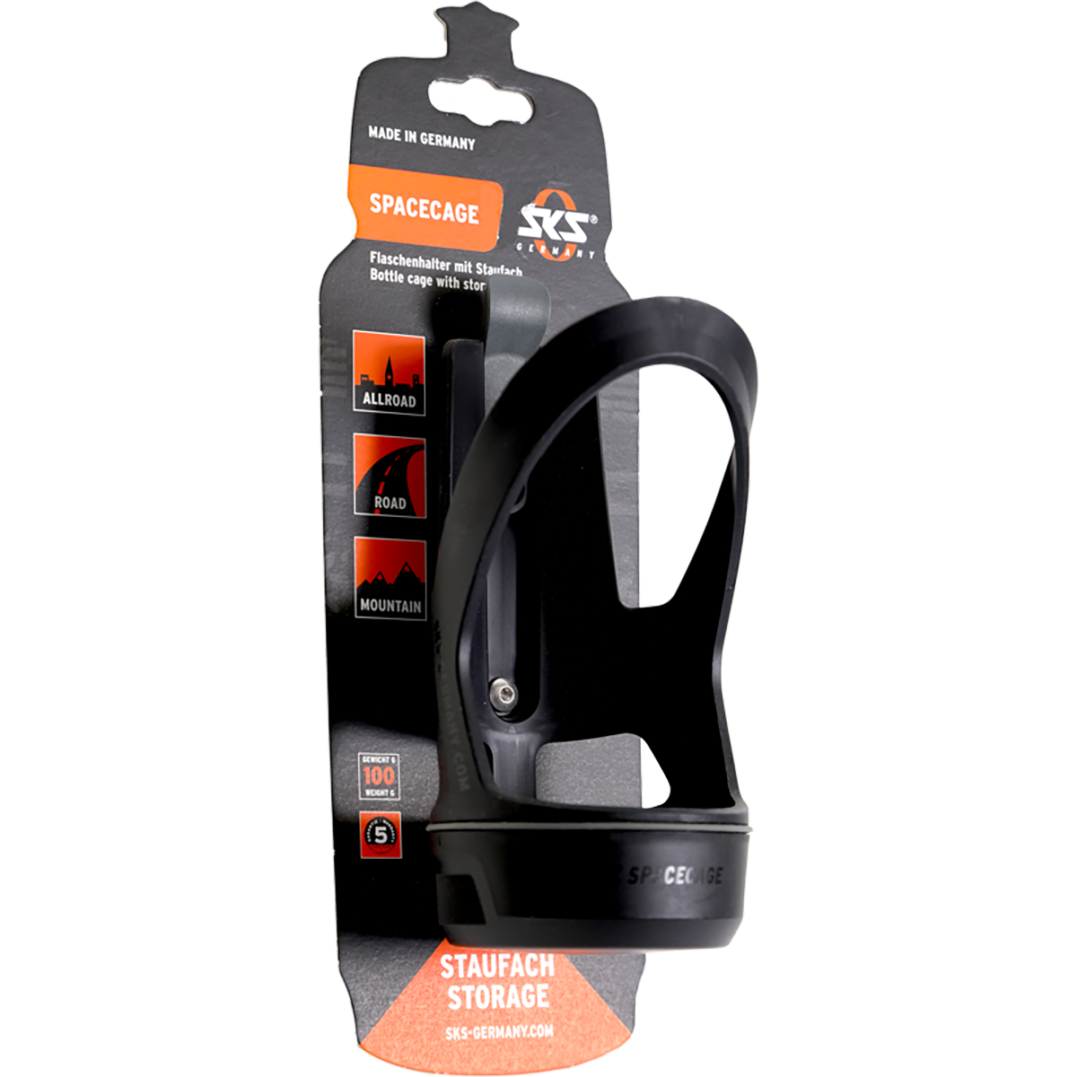 Држач за шишиња за вода со интегрирана преграда за складирање. Со двојно дно: SKS SPACECAGE не е само држач за шишиња за велосипеди што цврсто и сигурно го држи шишето со вода. Со едвај видлив простор за складирање на долната страна, тој нуди практична карактеристика. На овој начин, комплетите за поправка, клучевите или ситните ситници се безбедно складирани