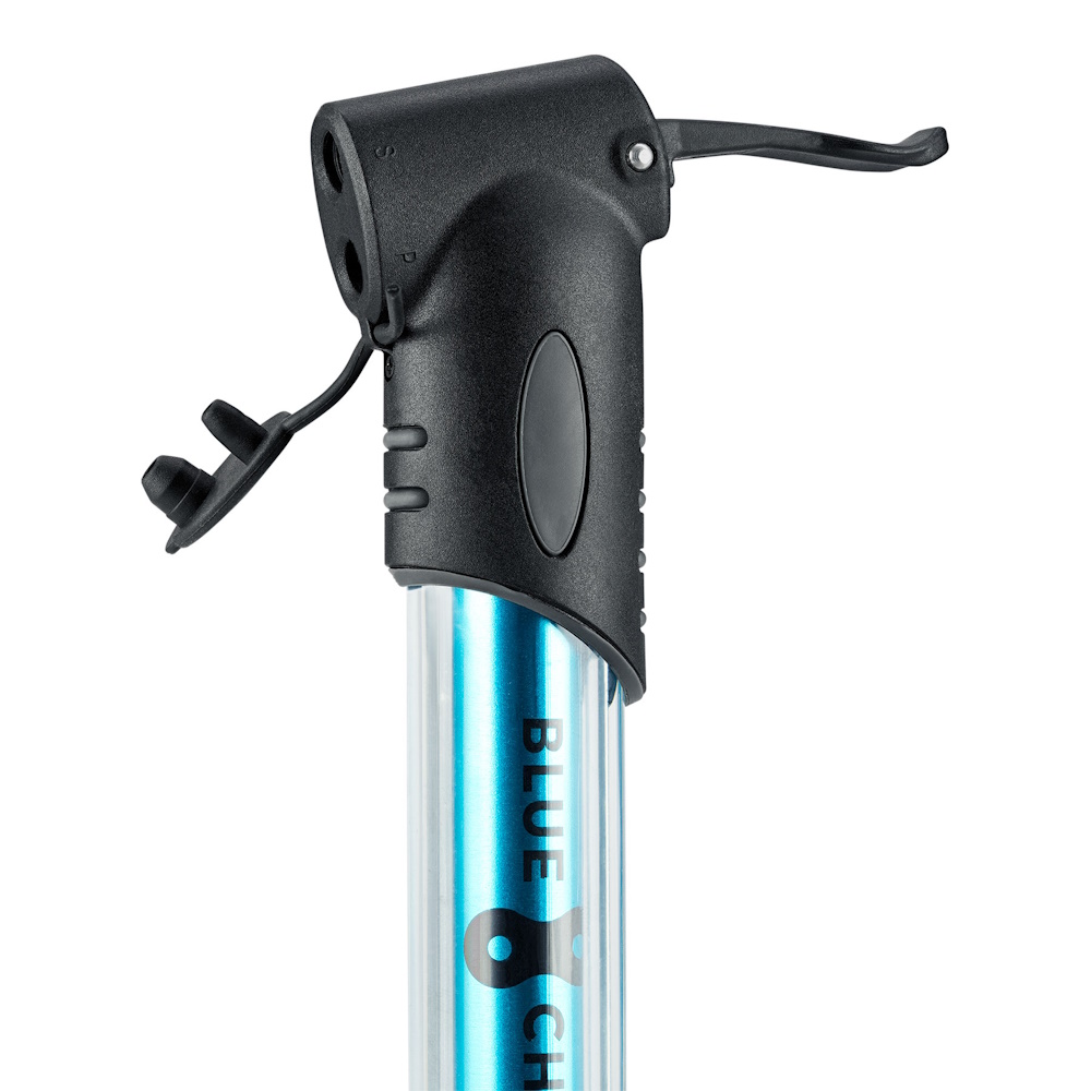 Цврстата телескопска пумпа со двоен вентил е погодна за вентилите Schrader и Presta. Рачката што се преклопува во форма на Т со функција за заклучување обезбедува сигурно држење.