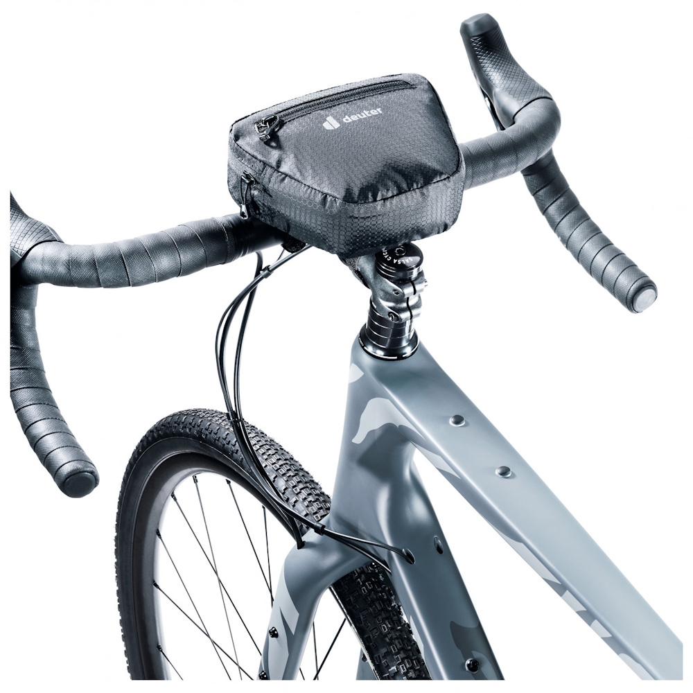 Сè под контрола на вашата велосипедска тура: торбичката од Deuter има доволно простор за складирање која се монтира на предните рачки! Практичната и компактна торба направена од рециклирана, лесна и цврста ткаенина од синтетички влакна. Главната преграда има вкупен волумен до 1,2 литри и нуди простор за телефон, паричник, клучеви или алатки. Мал преден џеб со патент е вклучен како дополнителна функција. Системот за монтирање Velcro овозможува цврсто прицврстување на сите вообичаени типови на рачки. Рефлектирачките елементи ја зголемуваат видливоста на предната торба при лоши услови на осветлување.